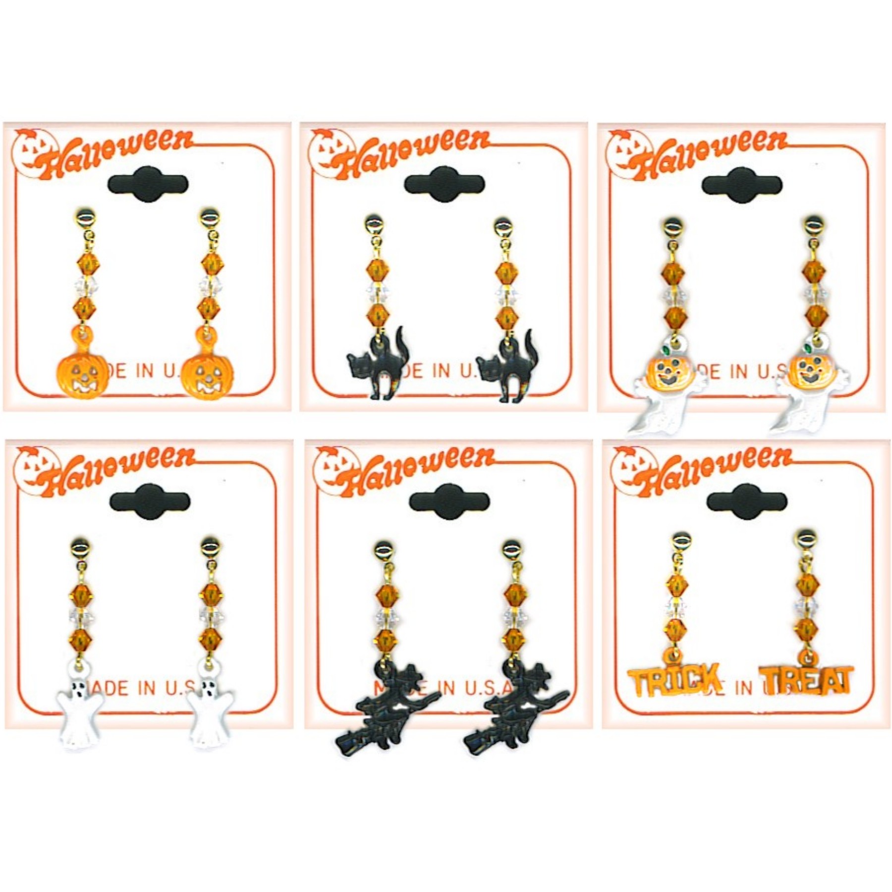 6 Austrian crystal beads adorn each pair of 6 style Halloween drop earrings. Shipped on Halloween rack / hang cards, in 1 dozen pack. (Price: $1.65 per pair). MADE IN USA