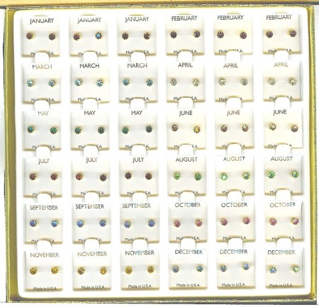 Birthstone Pierced earrings with Austrian Crystal stones in gold plate. Shipped 3 pair each month to 36 pair stand-up counter display. (Price: 60 cents / pair) MADE IN USA
