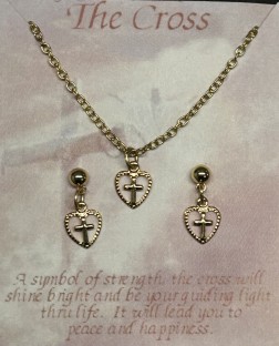 A Religious Cross in a Heart pair of dangle pierced earrings with a matching 18 inch necklace on one card. These gold plated pieces measure 3/8 inches, shipped on “The Cross” rack cards in 12 piece packs. (Price: $1,75 per set).  Makes a perfect Valentine’s Day or Mother’s Day gift. Proudly MADE IN USA