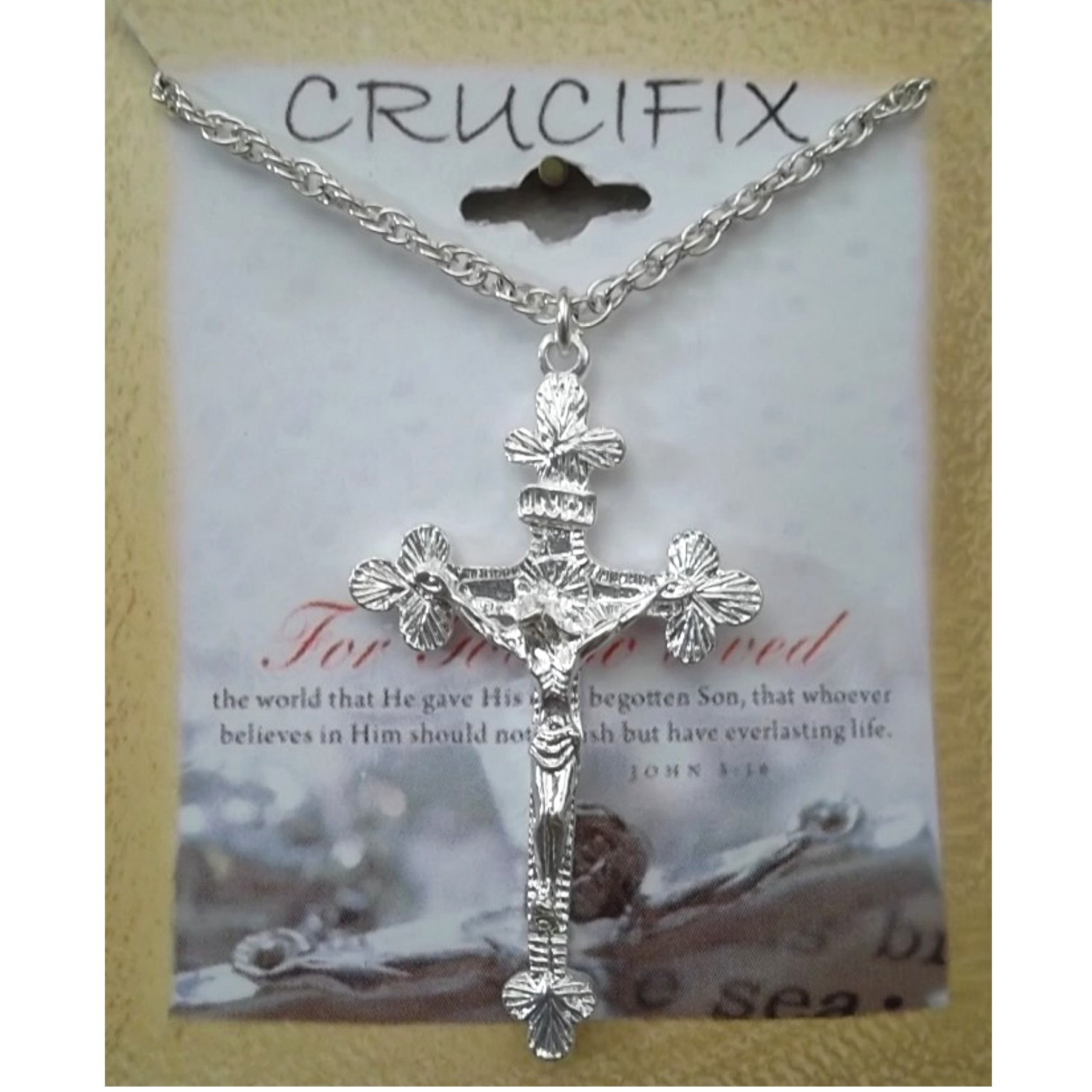 Catholic Jesus on Cross Crucifix 18 inch necklace in silver plate. Shipped 12 necks to pack on Crucifix rack card. Charms measure; 1 x 1.75 inches. (Price: $2.00 each). MADE IN USA (See gold version #1621, antique gold #1627 & Antique Silver Plate #1620)