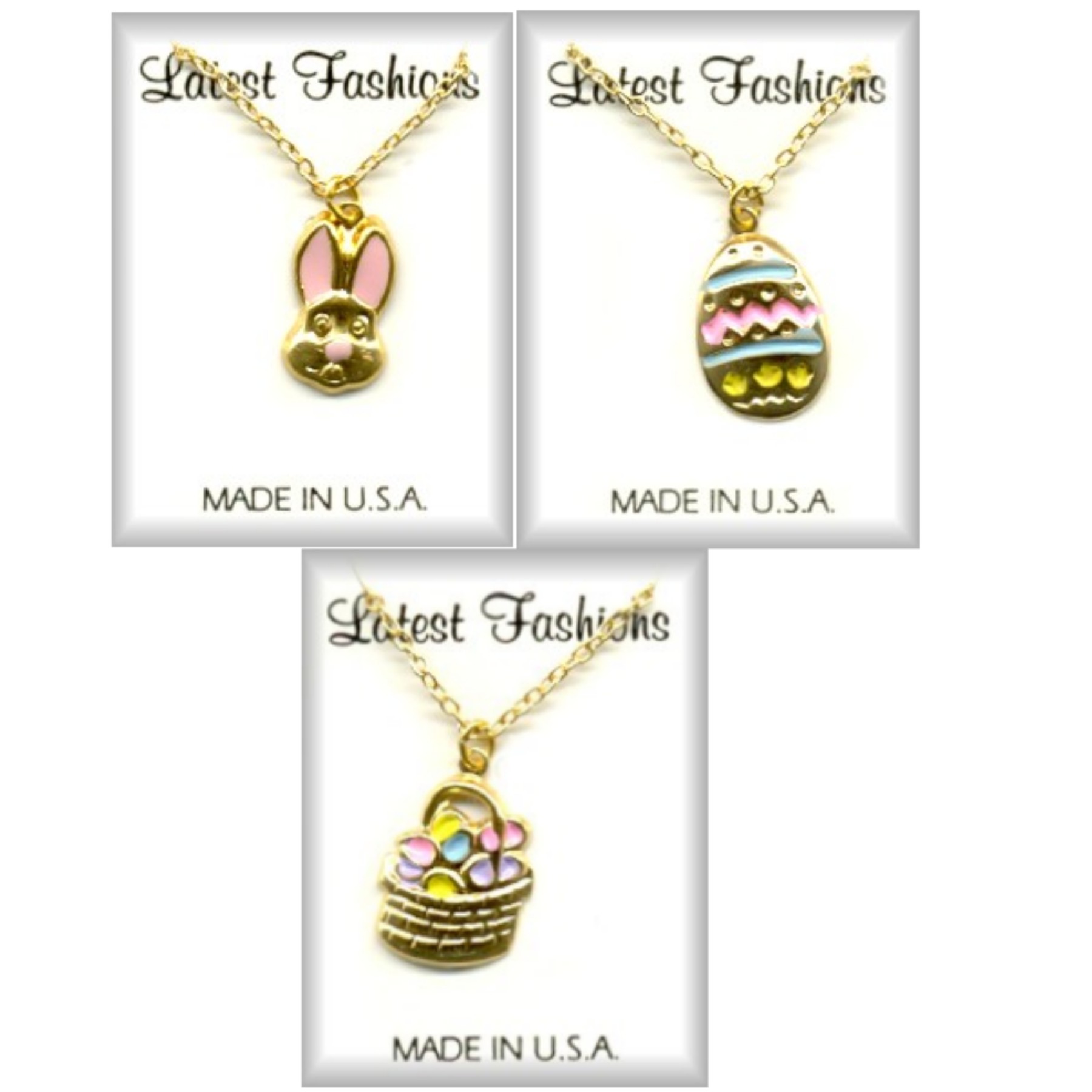 Easter assorted 18 inch necklaces in gold plate & hand-painted pastel colors. Each charm measures approximately 1/2 x 3/4 inch. Shipped 12 necks each on 1.5 x 2 inch cards in 3 dozen stand-up counter display. (Price: 90 cents each) Proudly Made in USA