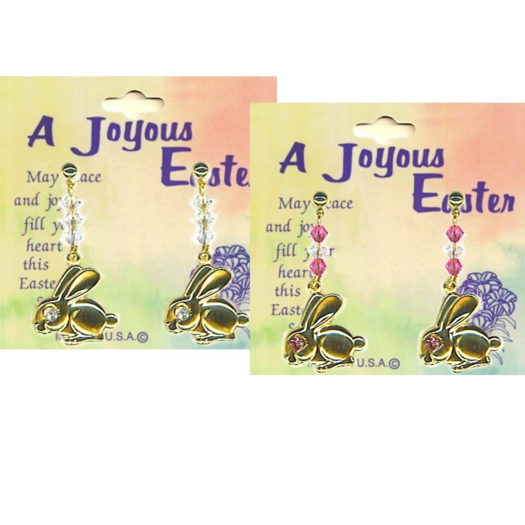 8 Austrian Crystal stones adorn these Easter Bunny drop earrings in gold plate. Earrings Measure; 3/4 inch. Shipped on 2 inch rack / hang card, in 1 dozen pack. (Price: $2.00 per pair) MADE IN USA