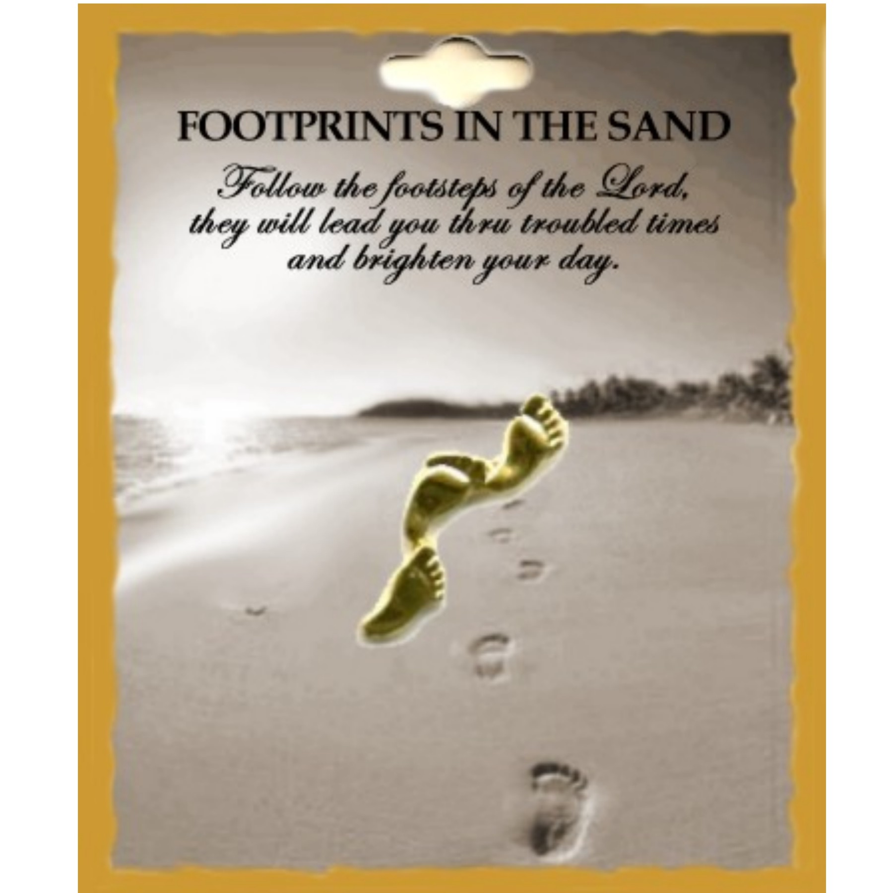Gold plated Footprints in the Sand lapel pin. Shipped on 2.5 x 3 inch “Footprints in the Sand” rack card, in 1 dozen pack. (Price: $1.05 each). Also available in 3 dozen stand-up display (#U-499) MADE IN USA