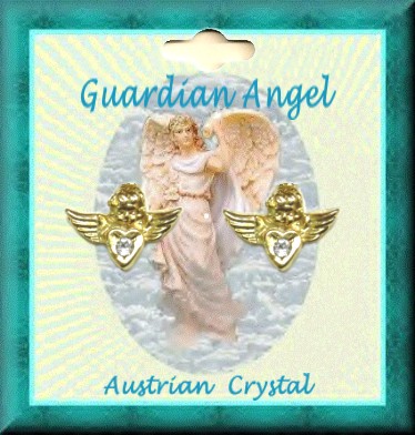 Guardian Angel pierced earrings with genuine Austrian Crystal stones in gold plate. Shipped on 2.5 inch Guardian Angel rack cards in 12 piece pack. (SPECIAL OVERSTOCK PRICE: 75 CENTS PER PAIR) MADE IN USA