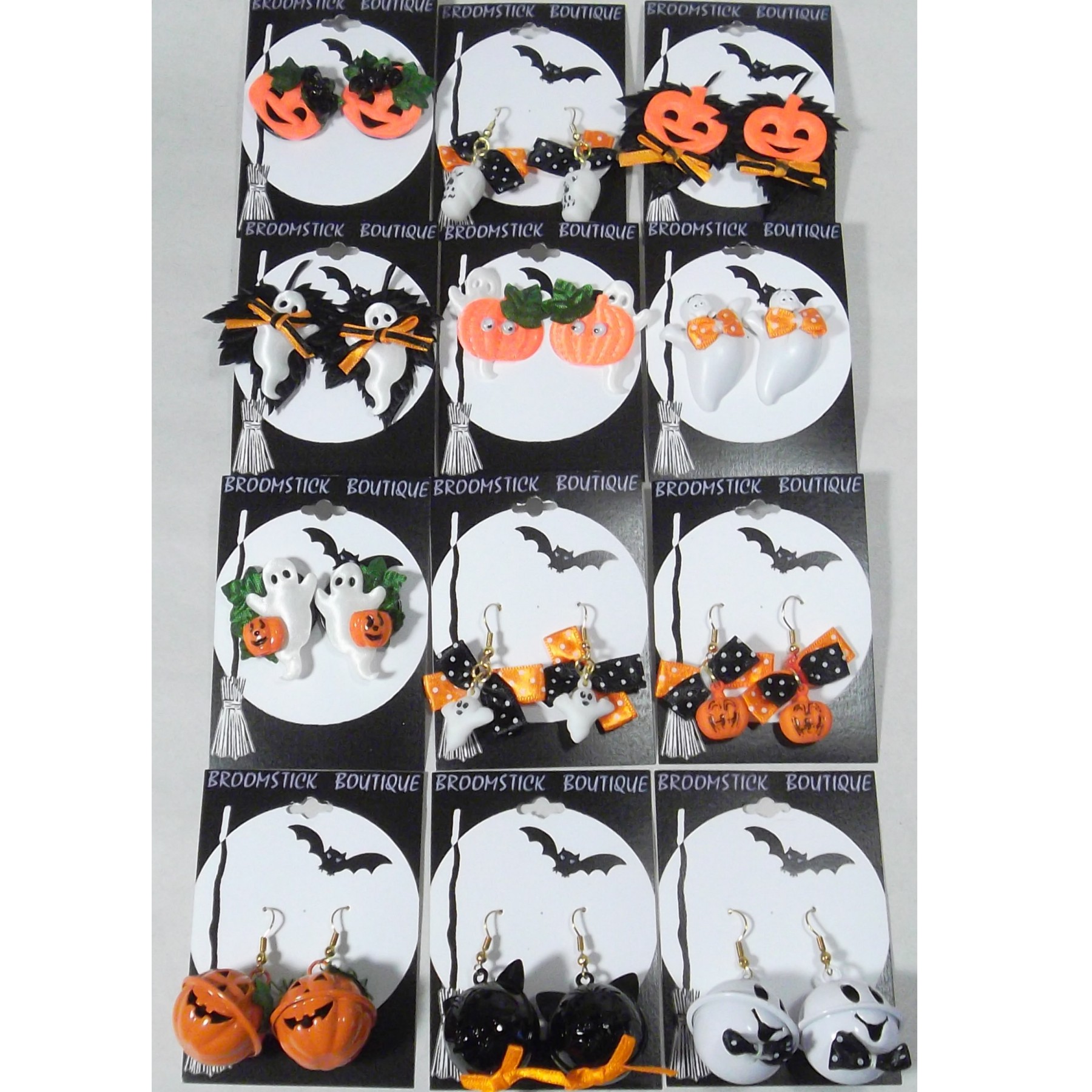 12 assorted styles Halloween pierced earrings post & dangle. Ships 12 pair to 1 dozen pack. (Price: $1.25 each).