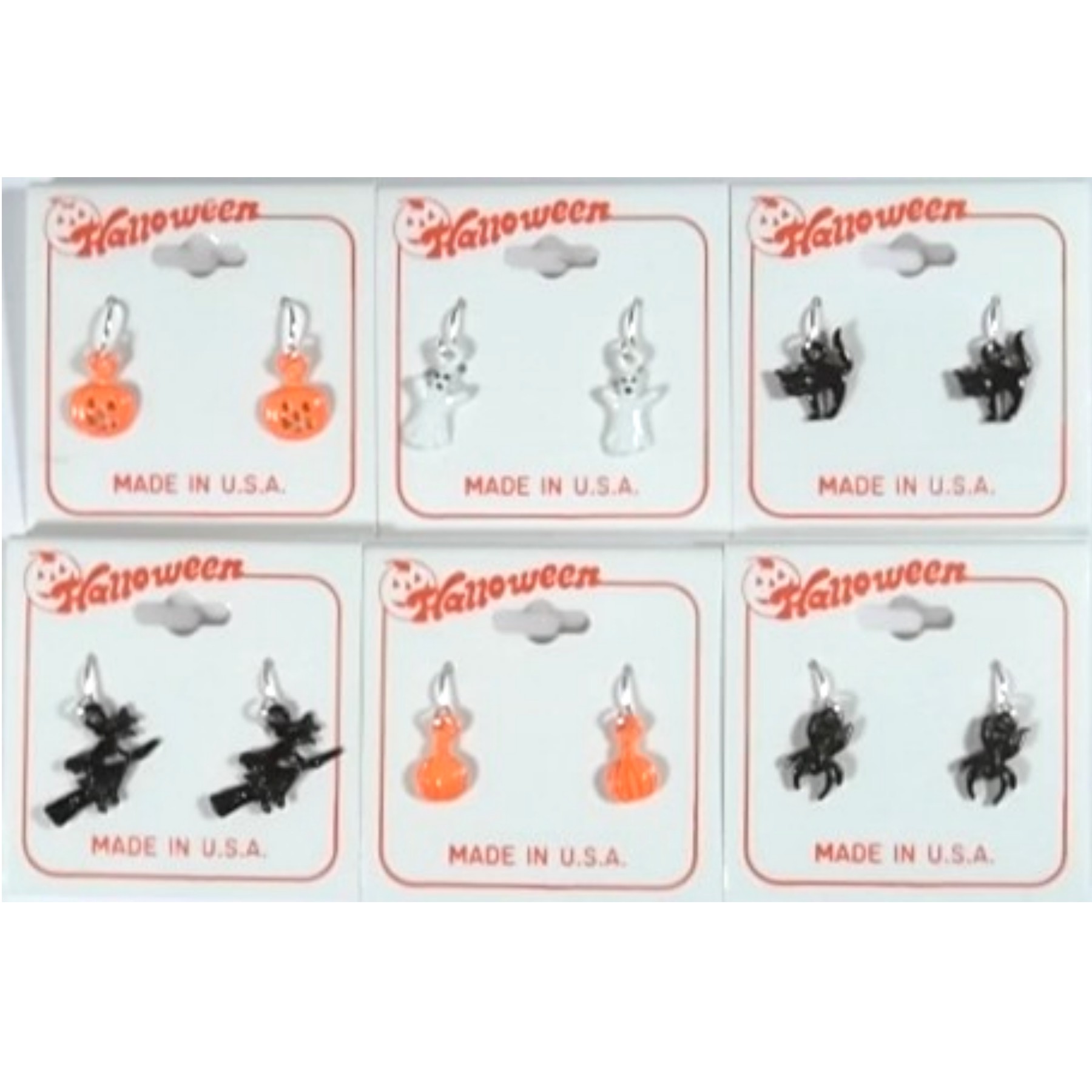 6 styles Halloween pierced earrings on fish hook dangles assortment. Each pair earring is on 2 inch rack / hang cards. Shipped 2 cards each style to 1 dozen pack. (Price: $1.00 / pair). MADE IN USA