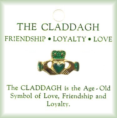 Irish Claddagh lapel or hat pin in gold plate & Irish green. Each pin Measures: 1/2 x 1/4 inch. Shipped on 2.5 inch Claddagh rack cards in 1 dozen pack. (Price: $1.25 each). Proudly MADE IN USA
