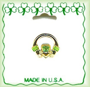 Irish Claddagh lapel or hat pin in gold plate & hand-painted Irish green. Each pin measures 5/8 inch round. Shipped on 2.5 x 2.5 Irish Claddagh rack card in 1 dozen pack. (Price: $1.05 each) MADE IN USA