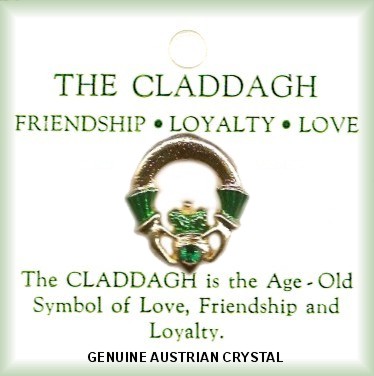 Irish Claddagh pin in gold plate & emerald Austrian Crystal stone. Each pin measures: 7/8 X 1 inch. Shipped on 2.5 X 2.5 inch Irish Claddagh rack card in 1 dozen pack. ($1.50 each) MADE IN USA