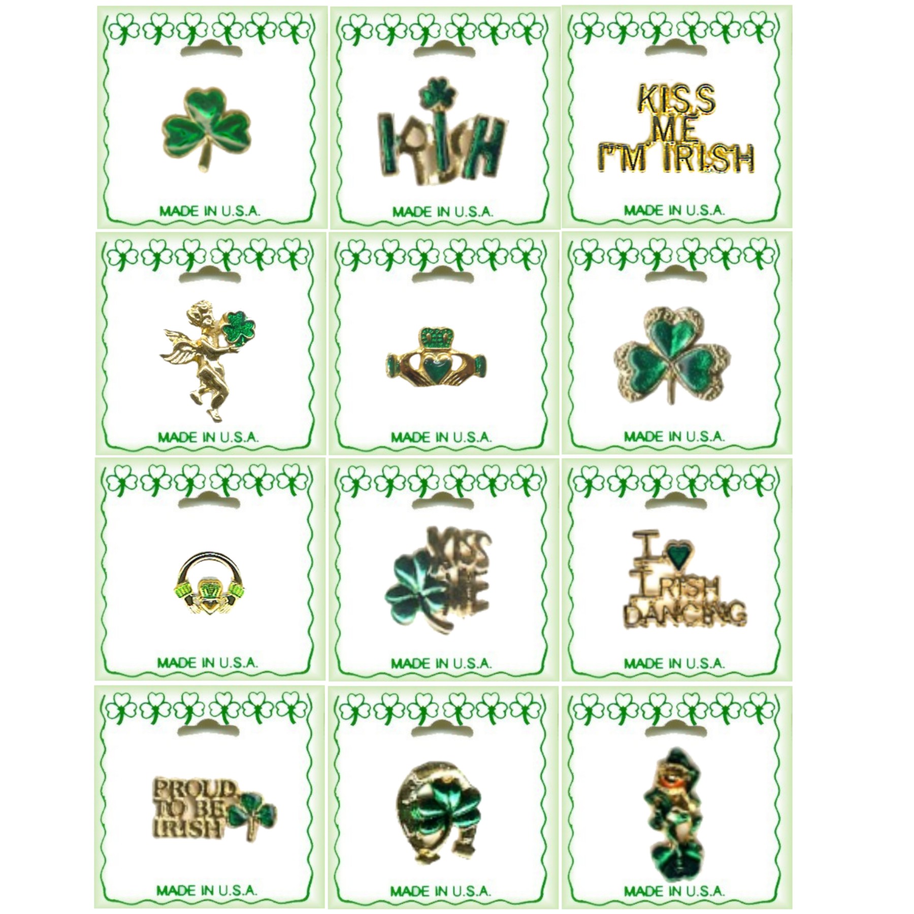 12 assorted Irish lapel or hat pins in gold plate & hand-painted colors. Each pin measures between 1 – 1.5 inches. Ships 12 pins to 1 dozen pack on 2 inch rack / hang cards. (Price: $1.10 each) MADE IN USA