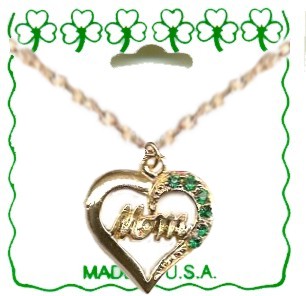 6 genuine Austrian Crystal Irish emerald rhinestones adorn this Heart shaped “Mom” necklace with 18 inch chain in gold plate. Shipped on 2 inch Irish rack/hang card, in 1 dozen pack. (Price: $2.50 each) MADE IN USA