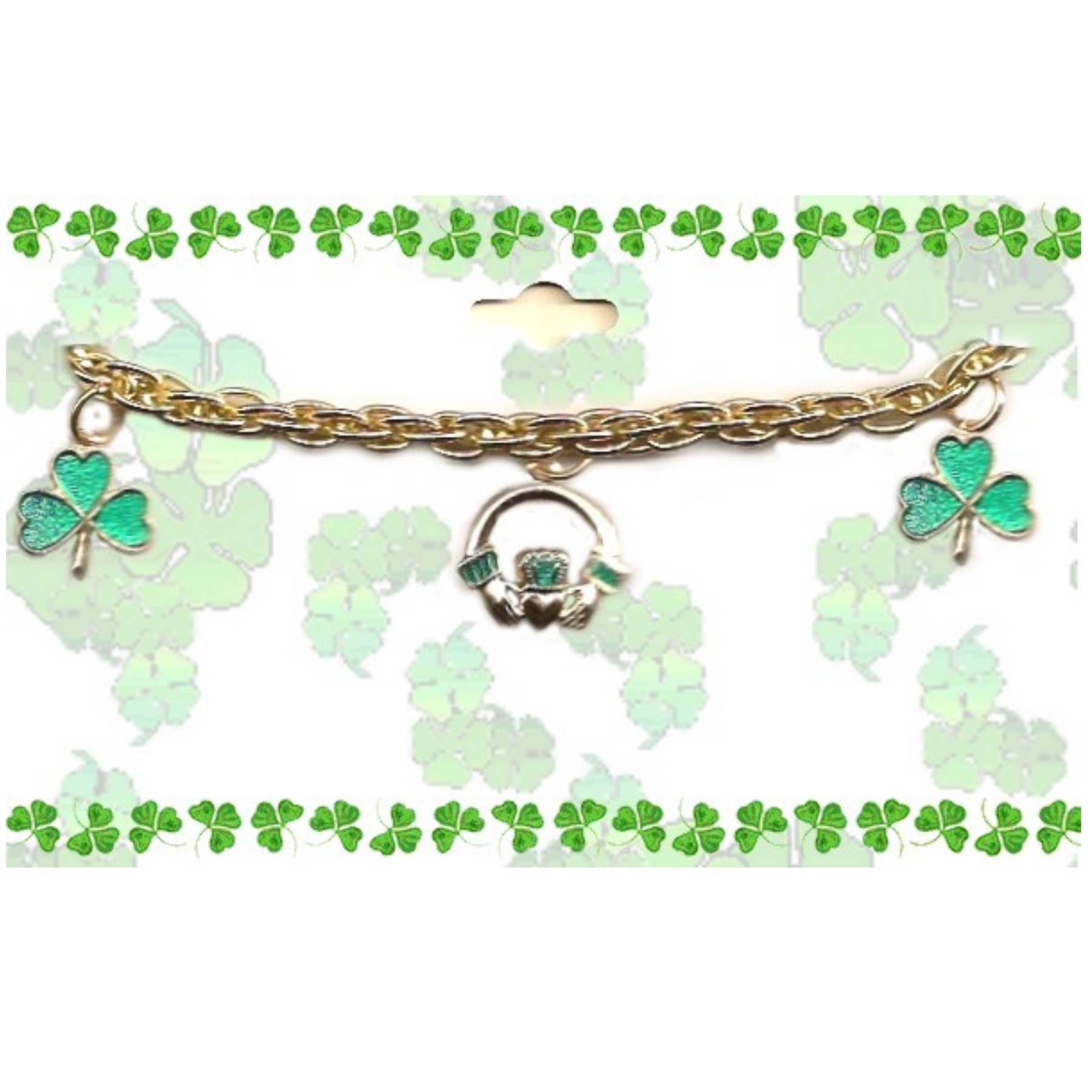 Irish & St. Patrick’s Day 7 inch bracelet with 1 Claddagh & 2 Shamrock charms. Each charm measures approximately 5/8 inches. Shipped 1 dozen to pack on Irish rack card. (Price: $2.25 each) MADE IN USA
