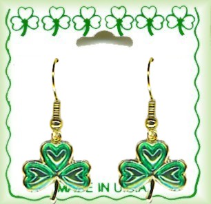 Gold plated shamrock dangle earrings with hand-painted Irish green color. Each earring measures: 5/8 inch on fish hook dangles. Shipped on 2 inch rack/hang cards in 1 dozen pack. (Price: $2.00 each) MADE IN USA