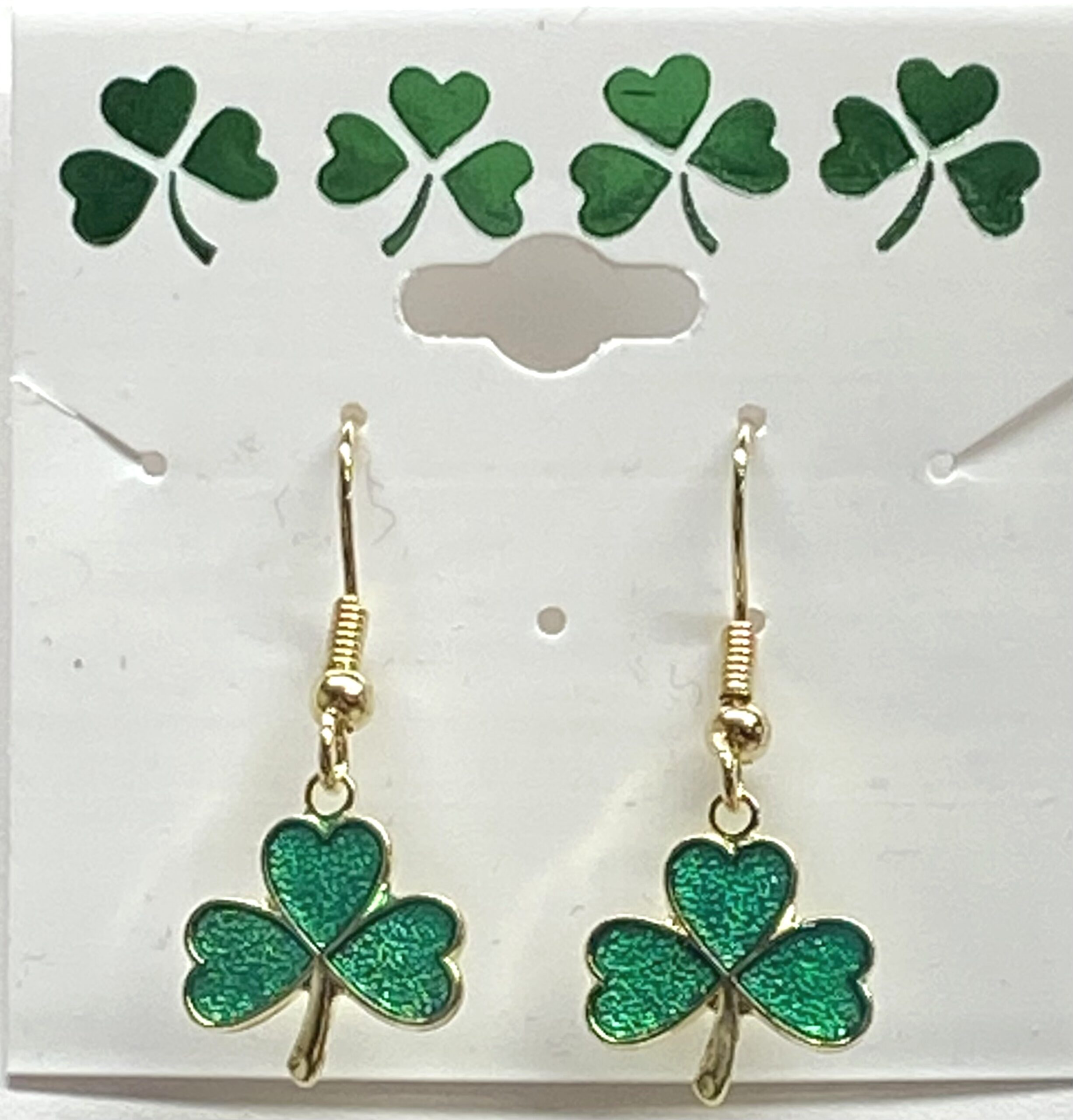 Shamrock drop earrings on fish hook dangles in gold plate. Each earring charm measures: 1/4 X 5/8 inches (Total length with fish hook=1 1/4 inches). Ships 12 pair to dozen pack, on 2 X 2 inch rack / hang card. Price:  $1.05 per pair. Proudly Made in USA