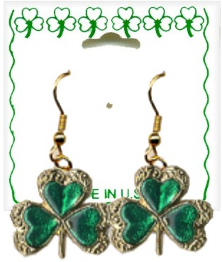 Gold plated shamrock dangle earrings with hand-painted Irish green color. Each earring measures: 1 x 1 inch. Shipped on 2 inch rack/hang cards in 1 dozen pack. (Price: $2.00 per pair) PROUDLY MADE IN USA