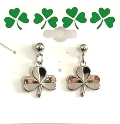 Irish dangle Shamrock pierced earrings in silver plate. Each earring measures 5/8 x 7/8 inch on ball top. Shipped on 2 X 2 inch Irish hang / rack cards in 1 dozen pack. (Price: $1.25 / pair) PROUDLY MADE IN USA