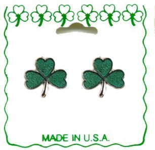Irish shamrock pierced earrings in silver plate & hand-painted Irish green. Each earring measures 7/16 X 1/2 inch. Shipped 12 pair to 1 dozen pack on 2″ X 2″ rack / hang cards. Price: $1.05 / pair. MADE IN USA