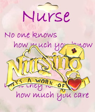 Nurse’s brooch with “Nursing It’s A Work Of (Heart)” script and red heart. Each pin measures 2.25 x 2.5 inches. Shipped on 2.5 x 3 inch Nurses rack card. Ideal for Hospital Gift Shops. (Price: $1.75 each).