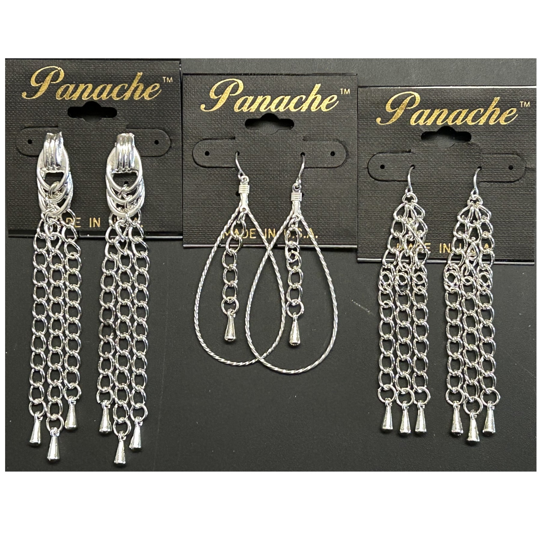 Sterling silver plated dangle earrings assortment.  Shipped on 2×2 inch rack/hang cards in 1 dozen packs. Measure: width; 1/2 – 1 inch, length; 2 1/4 – 3 1/4 inches. (Price: $1.30 / pair). Proudly MADE IN USA.