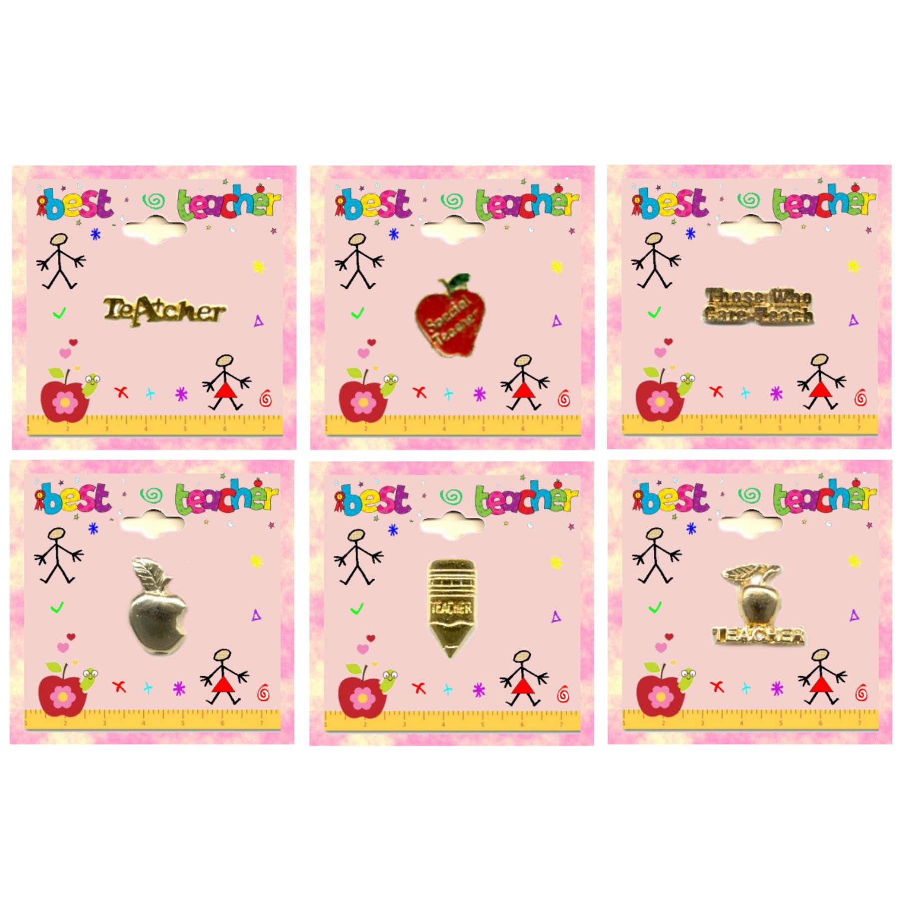 Teacher lapel Pin Assortment in gold plate, & hand-painted color. Pins measure approximately .5 – 1 inch. Shipped on 2.5 inch “Best Teacher” rack card, in 1 dozen pack. (Price: $1.00 each) MADE IN USA