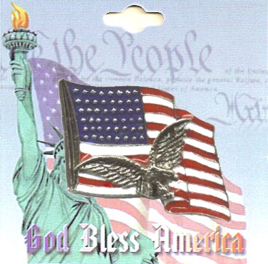 American Eagle on USA flag pin in silver plate & hand-painted colors. Pin measures: 1.5 x 1.25 inches. Shipped 12 pins on 2.5 inch Patriotic rack cards to 1 dozen pack. (Price: $3.50 each) PROUDLY MADE IN USA