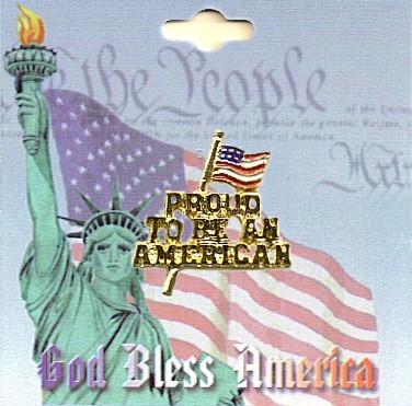 USA pin with American Flag & “PROUD TO BE AMERICAN” script, in gold plate & hand-painted epoxy. Pin measures 1 x 1-1/8 inch, shipped on 2.5 inch USA rack card. (Price: $1.25 each) PROUDLY MADE IN USA