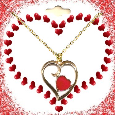Eternity heart 18 inch necklace in gold plate with red hand-painted heart inside. Ideal for Valentine’s Day, Mother’s Day, or just to say “I love you.”  Each heart charm measures; .75 x 1 inch, shipped on 2.5 inch heart rack card in 1 dozen pack. (Price: $1.50 each)  MADE IN USA
